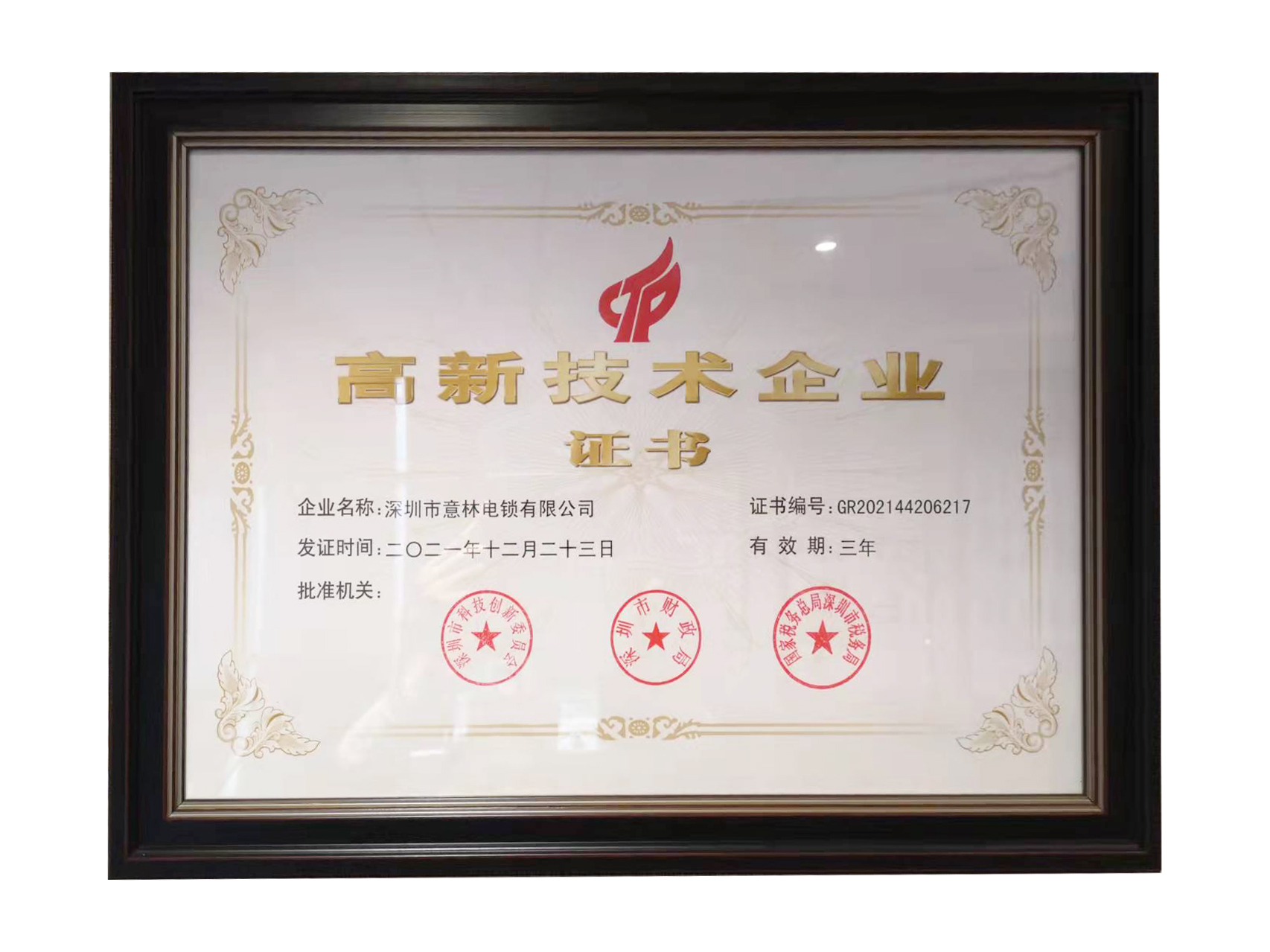 深圳市意林電鎖有限公司榮獲由深圳市科技創(chuàng)新委員會、深圳市財政委員會、深圳市國家稅務局、深圳市地方稅務局聯(lián)合頒發(fā)的“國家高新技術企業(yè)”證書,標志著意林電鎖公司在環(huán)保、研發(fā)領域和創(chuàng)新方面得到國家的肯定與認可,也預示著意林電鎖未來的發(fā)展將步入科技創(chuàng)新