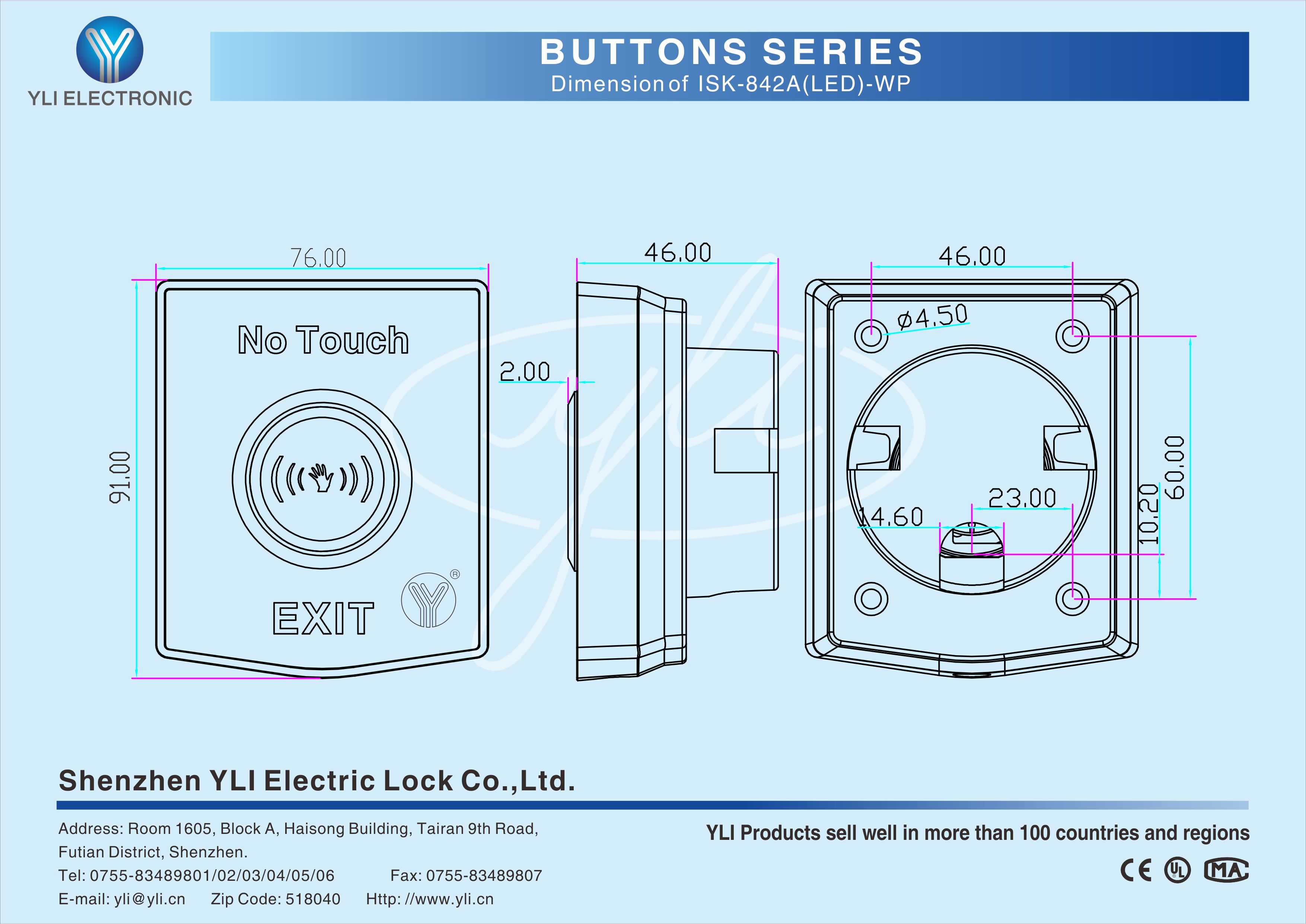 ISK-842A(LED)-WP is an Infrared Sensor Exit Button with stainless steel in size of 76Lx91Wx46H(mm) , American Standard,suitable for all kinds of locks. 10cm induction distance is adjustable, 3S Time delay is adjustable. Red??LED indicator: Power ON(standby);Green LED indicator: Power ON(sensation).