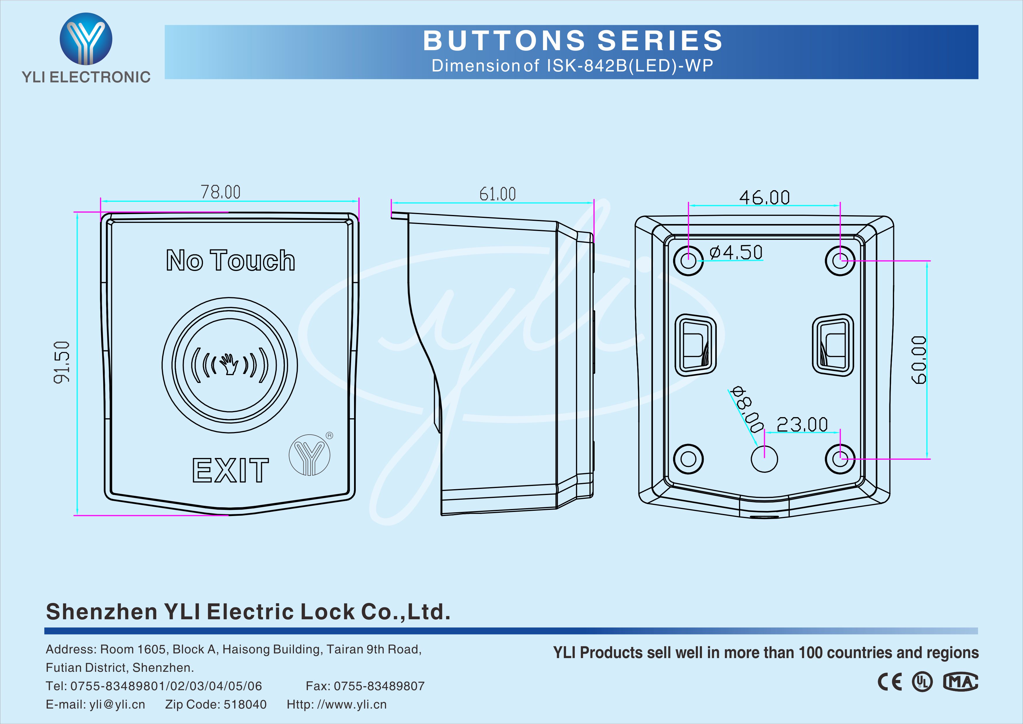 ISK-842B(LED)-WP is an Infrared Sensor Exit Button with stainless steel in size of 78Lx91.5Wx61H(mm) , American Standard,suitable for all kinds of locks. 10cm induction distance is adjustable, 3s Time delay is adjustable. Red??LED indicator: Power ON(standby);Green LED indicator: Power ON(sensation).