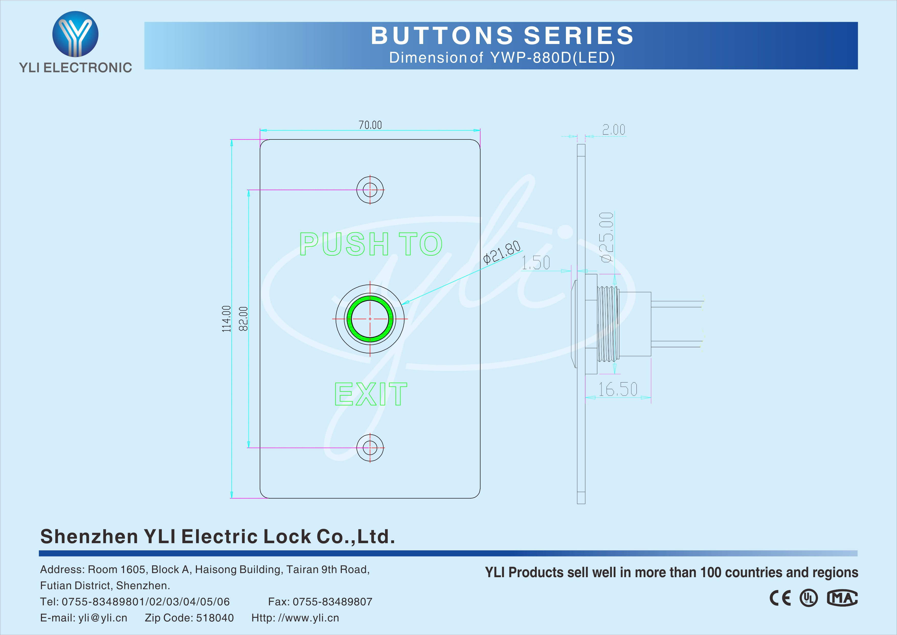 YWP-880D(LED) is a stainless steel door release button with LED in size of 114Lx70Wx20H(mm),IP-67 waterproof design, dustproof, American standard,which is the most common and the most frequently used in the access control systems.