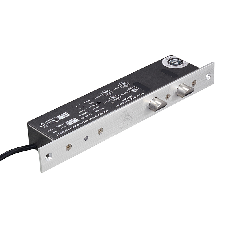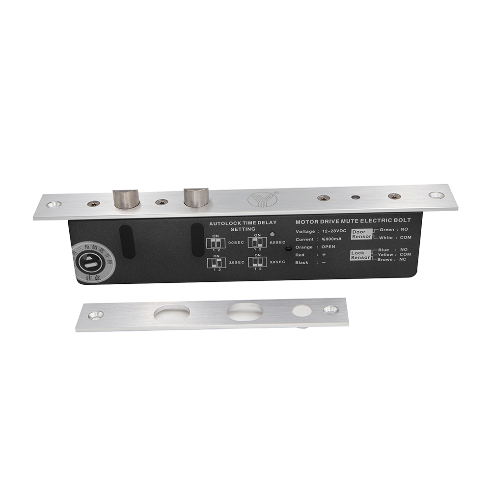 The motor driven mute electric bolt is locked and unlocked by the activity of the bolt which is driven by the stepping motor. The stepping motor has great strength, the powerful thrust of the stepping motor can be used to push the bolt to align the door to achieve the purpose of locking when the door is deformed or skewed. All parts are made of metal material, the mechanical structure of inserting and resetting has been treated with noise reduction. The two Hall components on the PCB board can accurately locate and control the stretch out and draw back of the bolt, so that unlocking and locking can be muted. Compared with the traditional electric bolt using solenoid valve structure, when the product enters the locking and unlocking state, there is no need to power the motor continuously, low energy consumption and environmental protection.