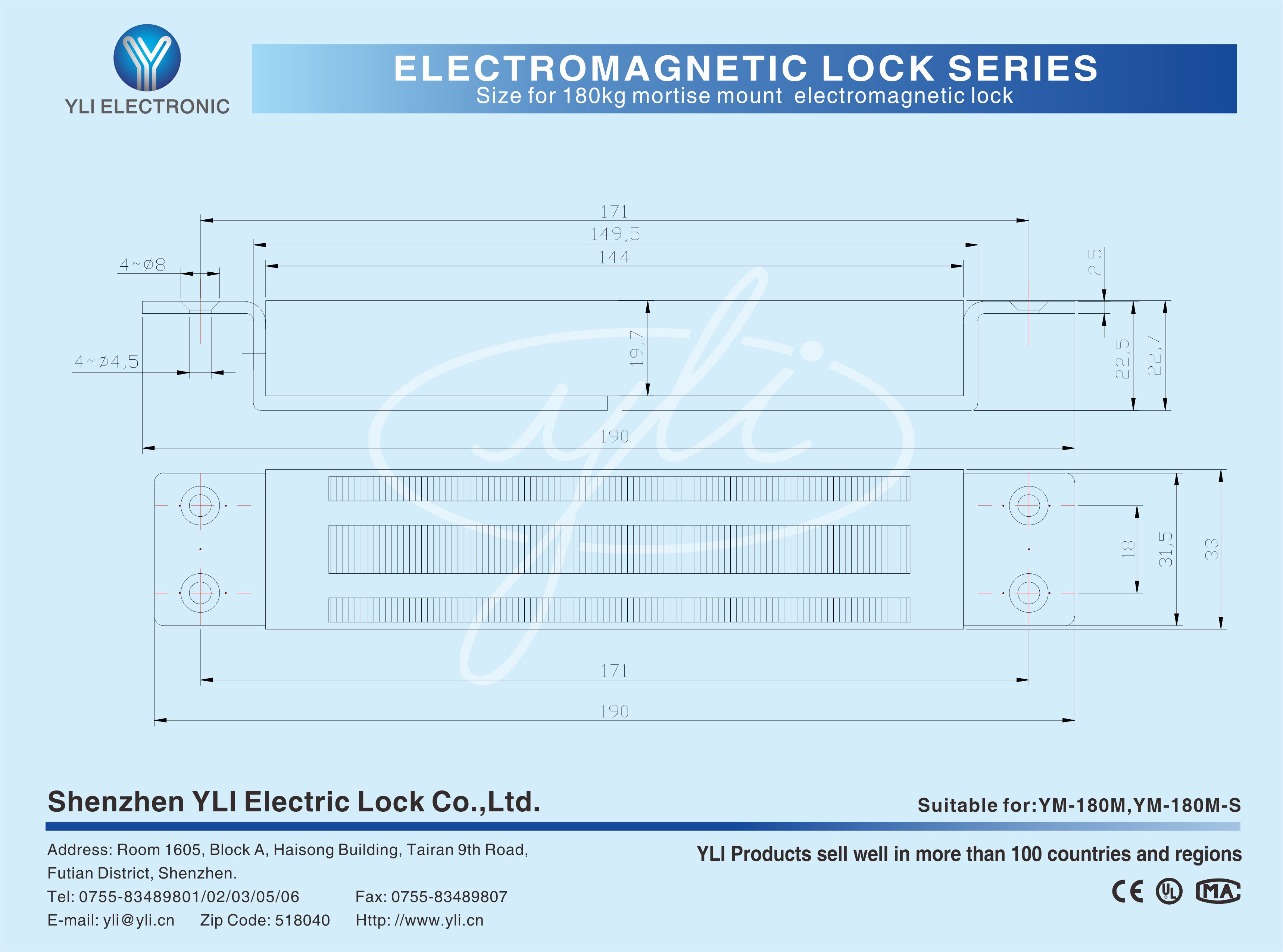 YM-180M/YM-180M-S Single door mortice magnetic lock is designed for wooden door, metal door, glass door, fire-proof door. There is a set of lock status signal (NO/NC/COM) output contacts, which provides real-time feedback for the access control system. YLl magnetic lock cores are produced with robotic laser welding technology, providing 2 to 3 times stronger impact resistance and torsional resistance than conventional production processes. The surface is treated with the internationally leading electroplating process and the lock itself has passed the 240-hour salt spray test in the national laboratory, achieving excellent performance of anti-oxidation, anti-rust and anti-corrosion, Our company offers a complete range of brackets for different locks.