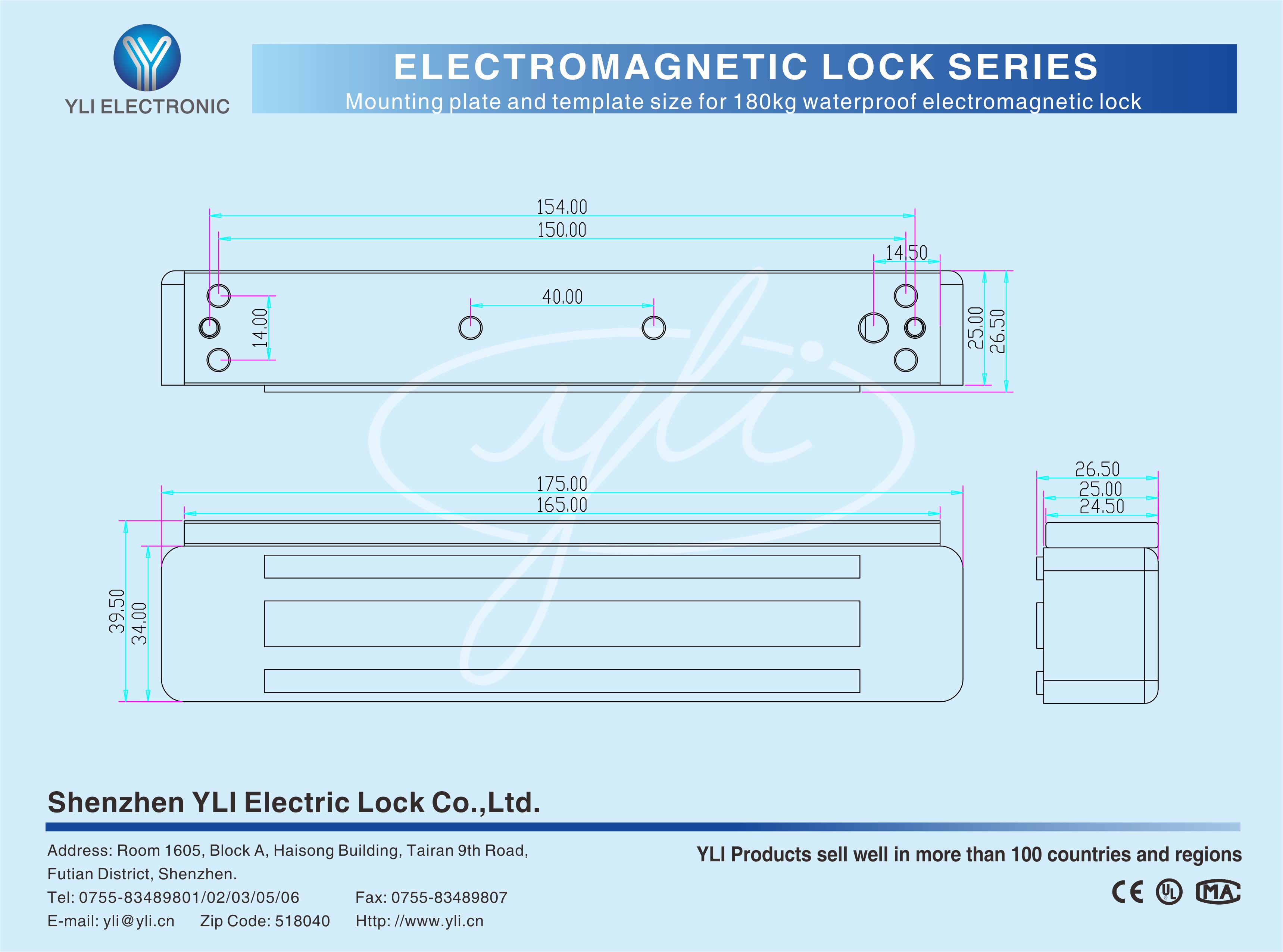 YM-180W-S The waterproof single-door magnetic lock with signal output is designed for metal doors, wooden doors, fireproof doors, glass doors, it's IP-68 rated, can be used outdoors and environment with high humidity and high salinity. Anti-drop steel cables are provided on both sides of the lock body. There is a set of lock status signal (NO/COM) output contacts. YLl magnetic lock cores are produced with robotic laser welding technology, providing 2 to 3 times stronger impact resistance and torsional resistance than conventional production processes. The surface is treated with the internationally leading electroplating process and the lock itself has passed the 240-hour salt spray test in the national laboratory, achieving excellent performance of anti-oxidation, anti-rust and anti-corrosion. Our company offers a complete range of brackets for different locks.