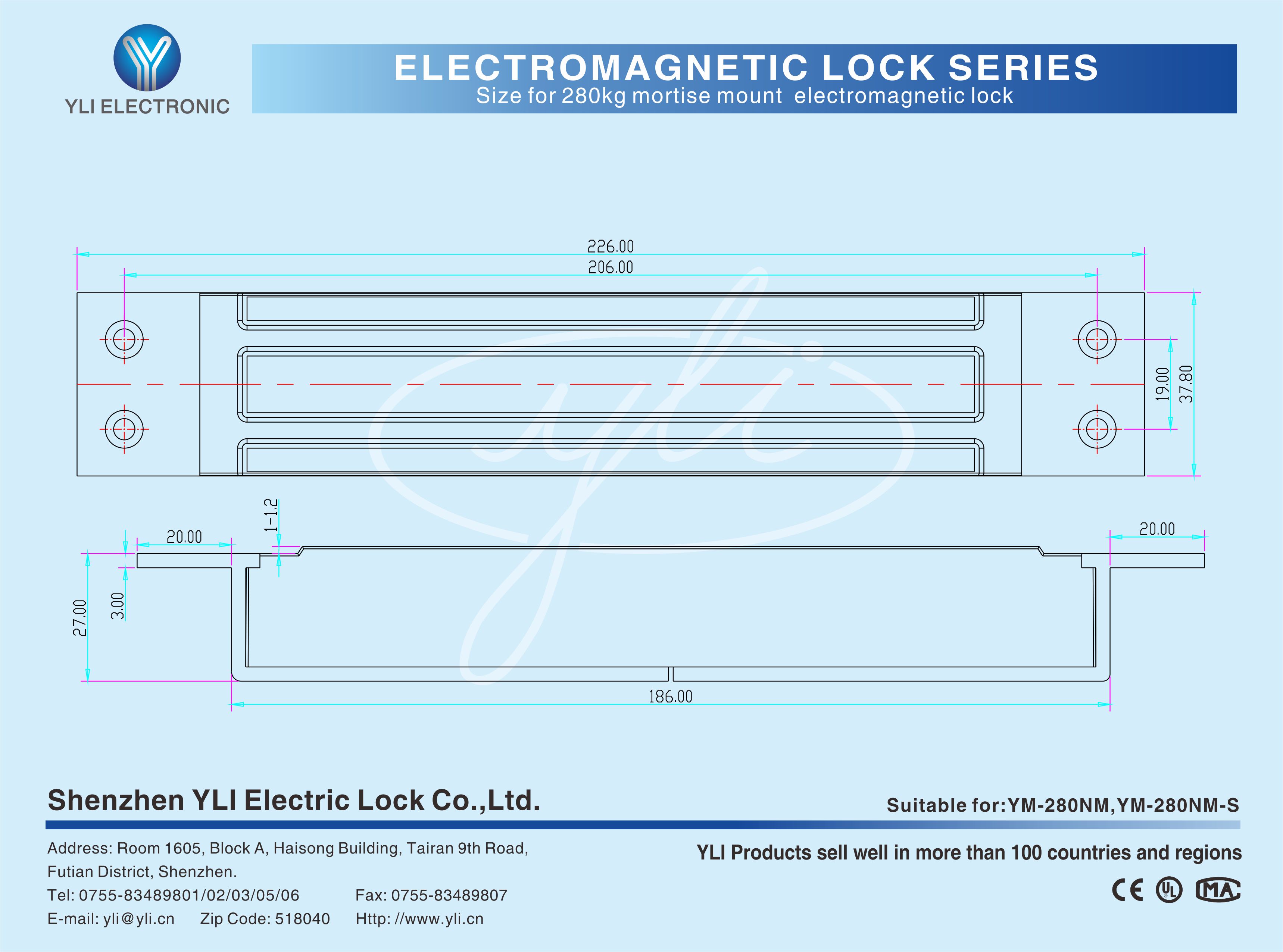 YM-280NM/YM-280NM-S Single door mortice magnetic lock is designed for wooden door, metal door, glass door and fireproof door. There is a set of lock status signal (NO/NC/COM) output contacts. YLl magnetic lock cores are produced with robotic laser welding technology, providing 2 to 3 times stronger impact resistance and torsional resistance than conventional production processes. The surface is treated with the internationally leading electroplating process and the lock itself has passed the 240-hour salt spray test in the national laboratory, achieving excellent performance of anti-oxidation, anti-rust and anti-corrosion. Our company offers a complete range of brackets for different locks.