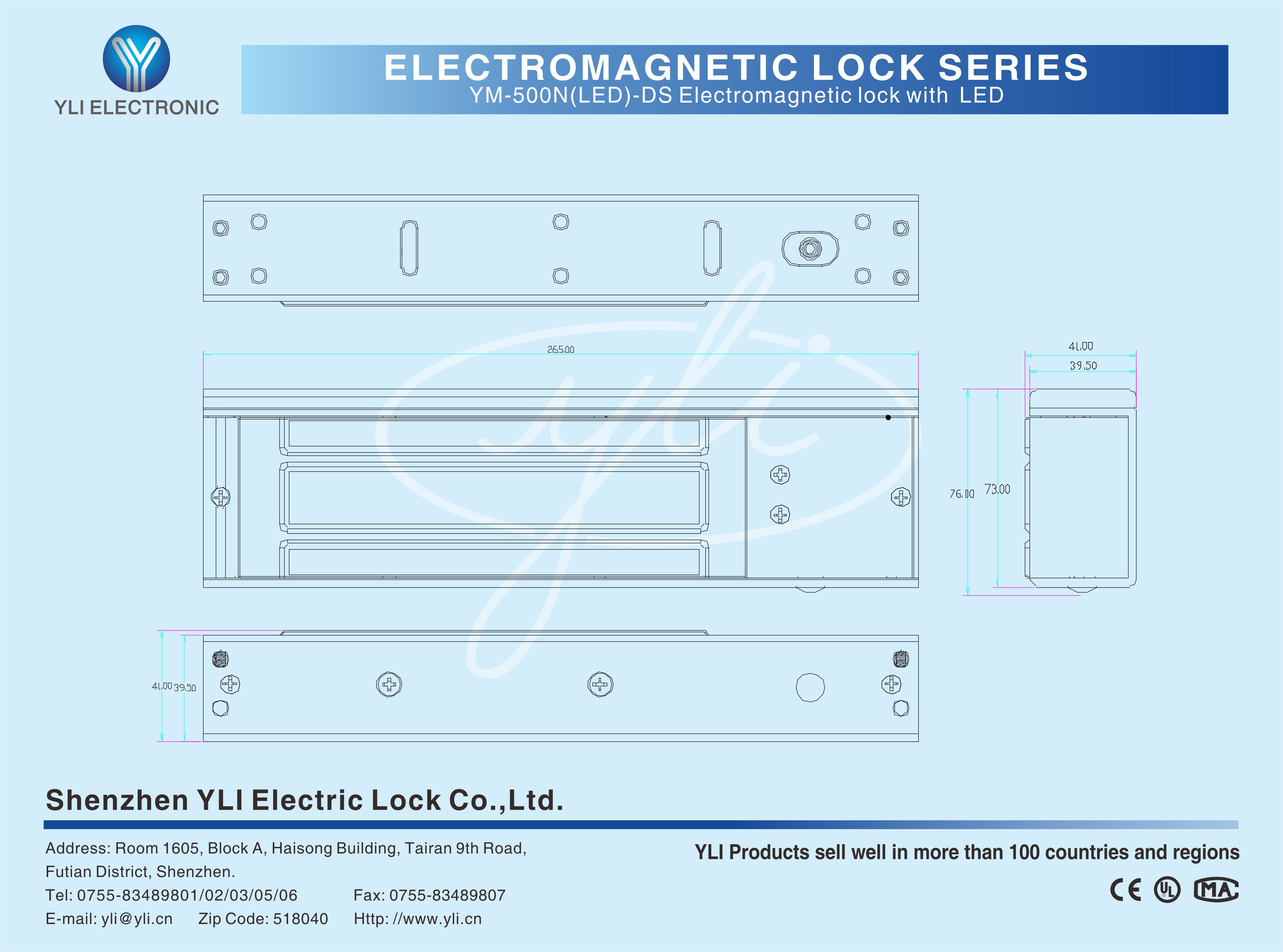 YM-500N(LED)-DS Single door magnetic lock is designed for wooden door, metal door, glass door and fireproof door. There are both lock status signal (NO/NC/COM) output contacts and door status signal (NO/NC/COM) output contacts. The lock body is equipped with a large LED light . The green light indicates unlocking, and the red light indicates locking. YLl magnetic lock cores are produced with robotic laser welding technology, providing 2 to 3 times stronger impact resistance and torsional resistance than conventional production processes. The surface is treated with the internationally leading electroplating process and the lock itself has passed the 240-hour salt spray test in the national laboratory, achieving excellent performance of anti-oxidation, anti-rust and anti-corrosion. Our company offers a complete range of brackets for different locks.