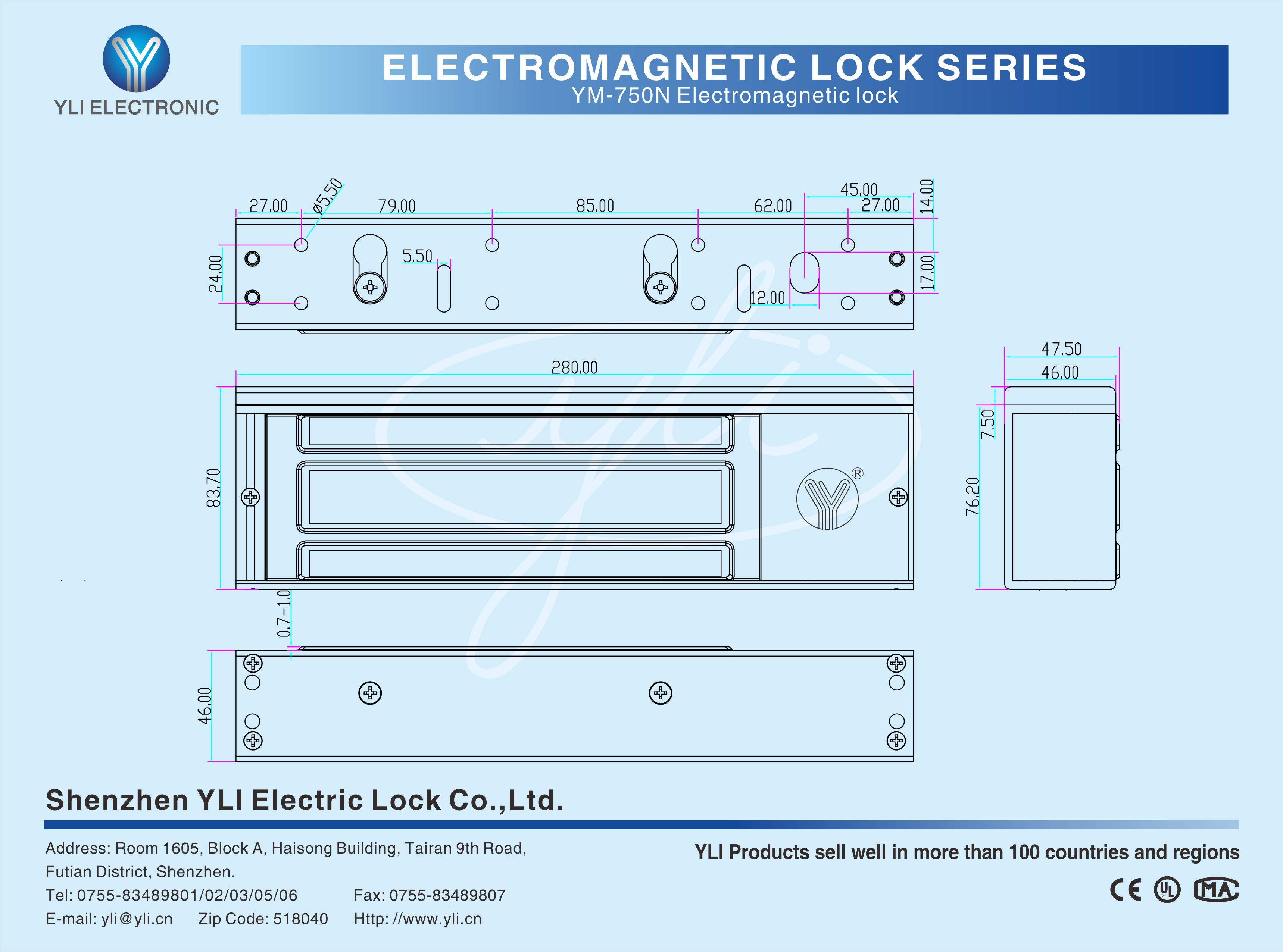 YM-750N Single door magnetic lock is designed for wooden door, metal door, glass door and fireproof door. YLl magnetic lock cores are produced with robotic laser welding technology ,providing 2 to 3 times stronger impact resistance and torsional resistance than conventional production processes. The surface is treated with the internationally leading electroplating process and the lock itself has passed the 240-hour salt spray test in the national laboratory, achieving excellent performance of anti-oxidation, anti-rust and anti-corrosion. Our company offers a complete range of brackets for different locks.