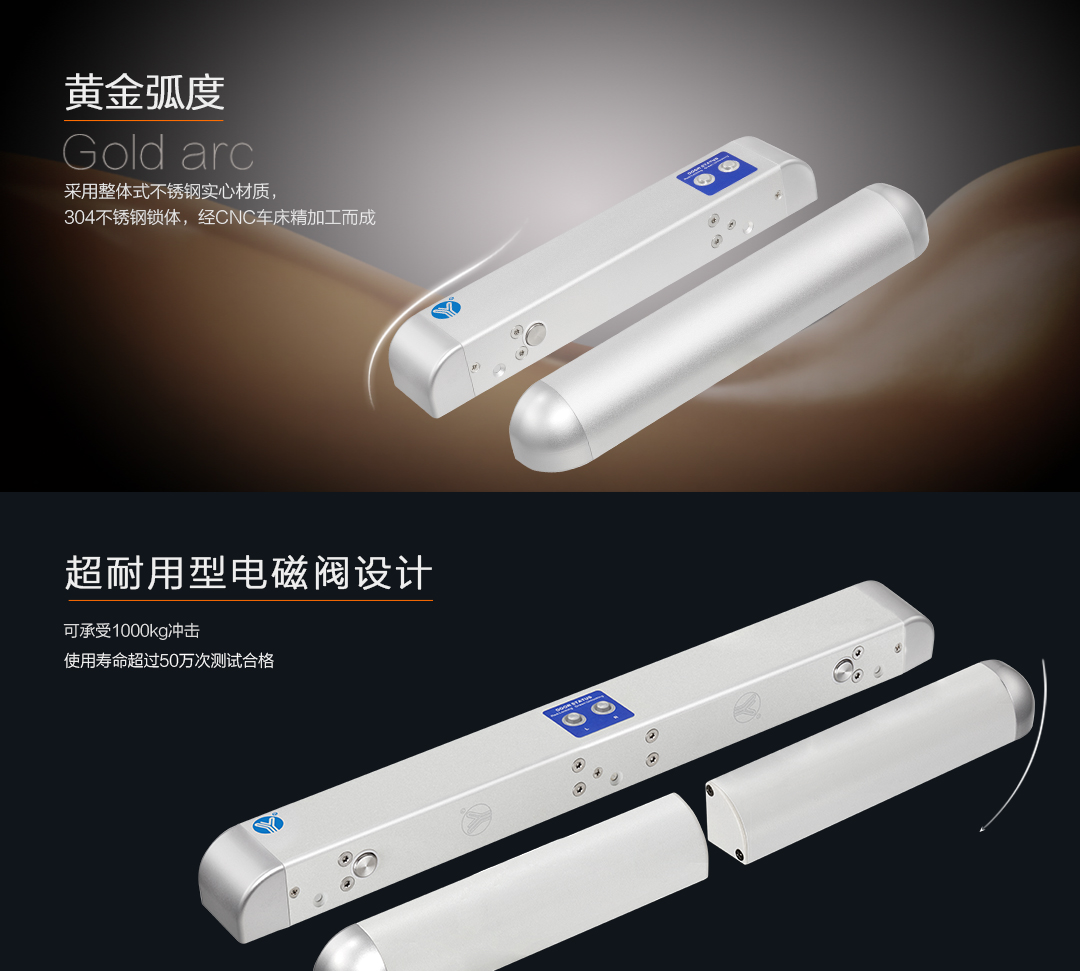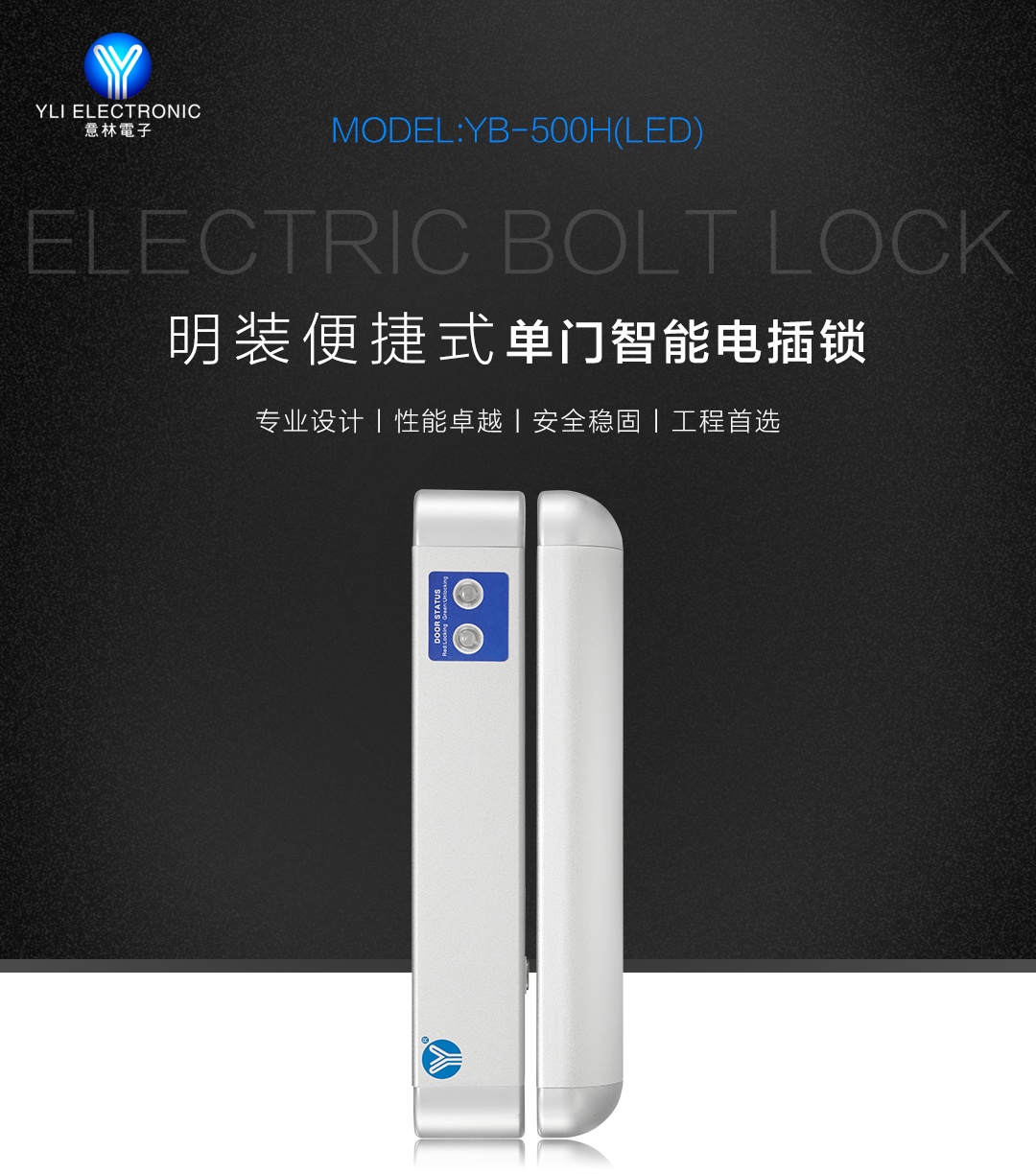 YB-500H系列明裝便捷式智能電插鎖高強(qiáng)度鋁合金材質(zhì),304不銹鋼鎖舌經(jīng)CNC車床精工而成,可承受1000kg推拉力, 而且鎖舌插出后防撬功能的特殊高保安設(shè)計(jì).