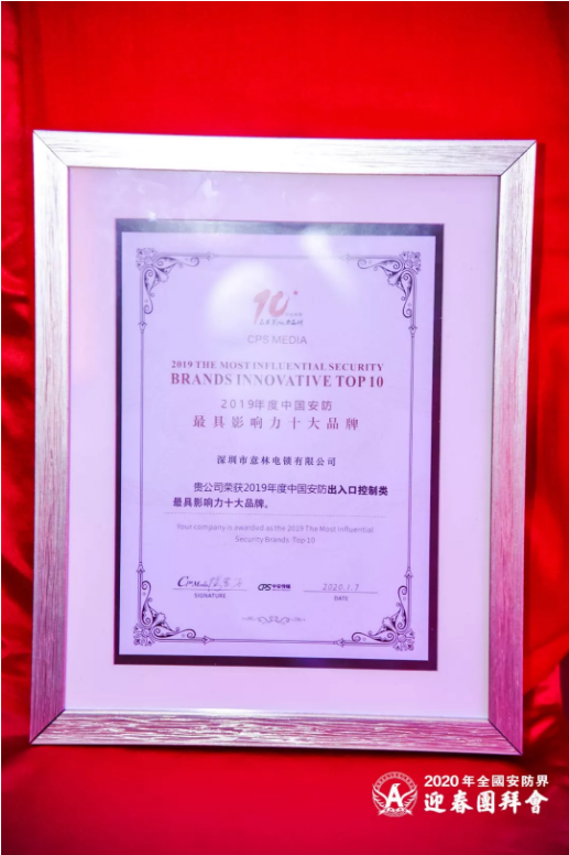 在會上,意林電鎖喜獲殊榮——“2019中國安防最具影響力十大品牌”獎!