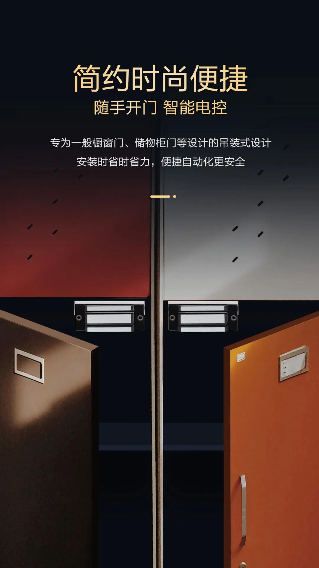 是針對一般櫥窗門、儲物柜門等小型柜門設(shè)計(jì)的,吊裝式設(shè)計(jì),安裝時省時、省力。內(nèi)開式門或無框玻璃門、窄框等均有附件配套,特殊防殘磁設(shè)計(jì),讓門禁自動化更安全。