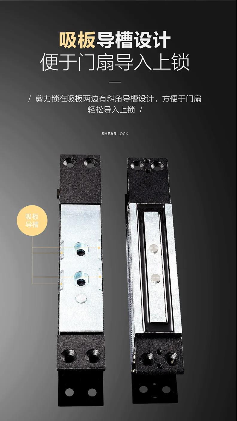 是運(yùn)用電磁吸力吸住吸板,讓鎖體的兩粒固定柱卡住吸板的鎖孔內(nèi),達(dá)到磁力加上固定柱卡住吸板的力量,產(chǎn)生非常強(qiáng)大的“剪力”。