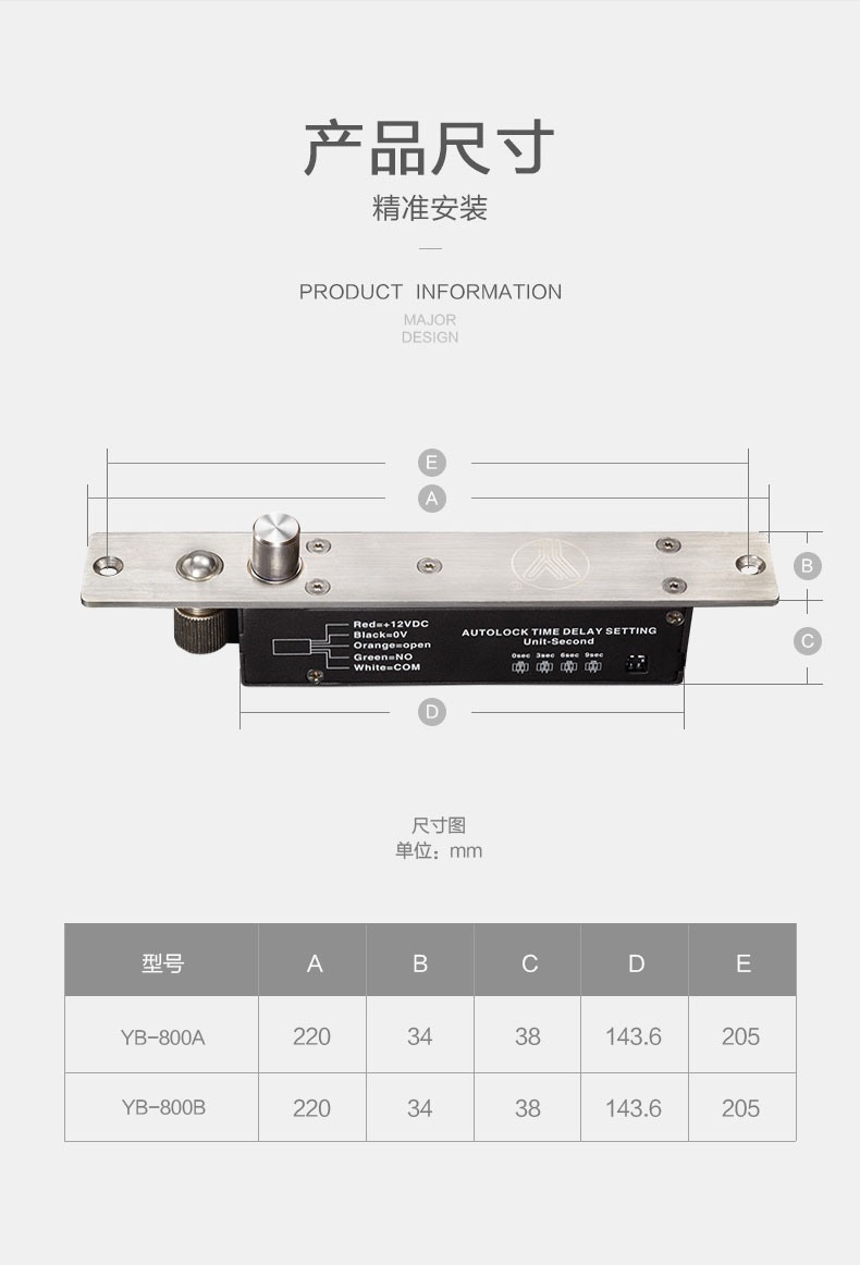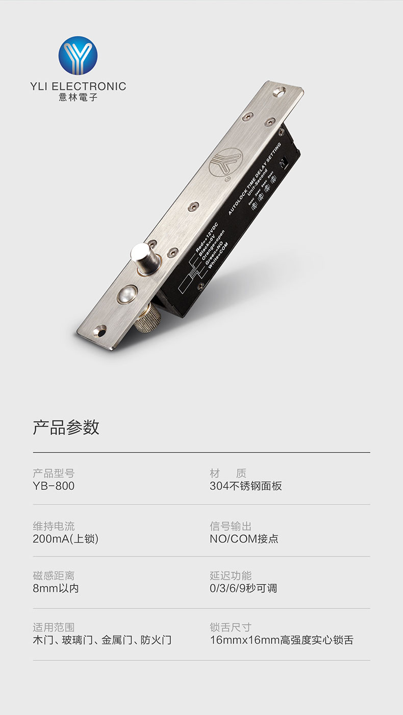 YB-800A采用全金屬結(jié)構(gòu),鎖舌采用整體式304不銹鋼實(shí)芯棒材,經(jīng)CNC車(chē)床精工而成,可承受2000kg沖擊,連動(dòng)部件全部采用金屬結(jié)構(gòu),在60℃高溫及零下40℃嚴(yán)寒的惡劣環(huán)境下可正常使用,專業(yè)耐用型電磁閥,特殊光電控制超低溫及超低功耗設(shè)計(jì),防入侵電路及智能邏輯電路設(shè)計(jì)等,多功能綜合于一體,是一款有效滿足重型門(mén)及特別高安保需求的場(chǎng)所安裝使用的最佳產(chǎn)品。