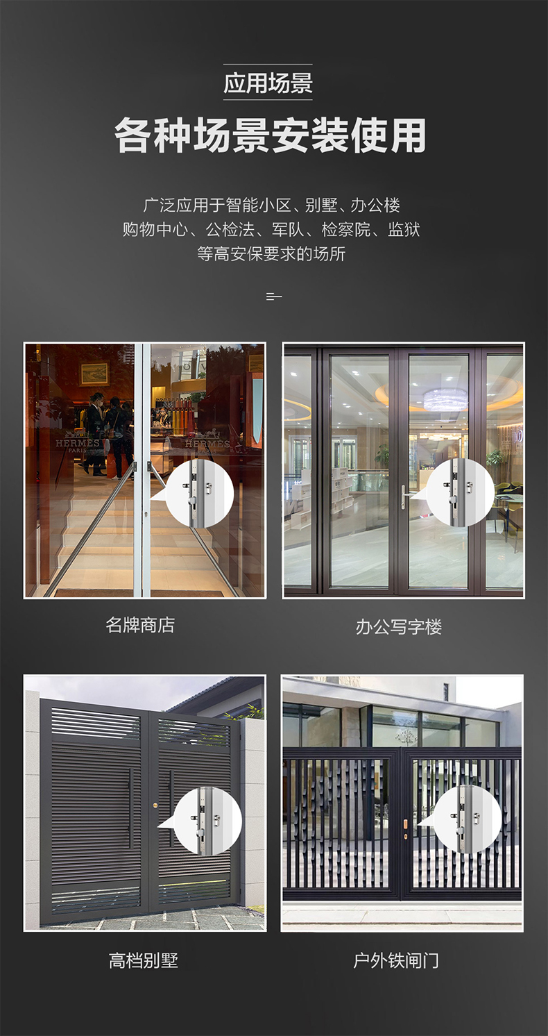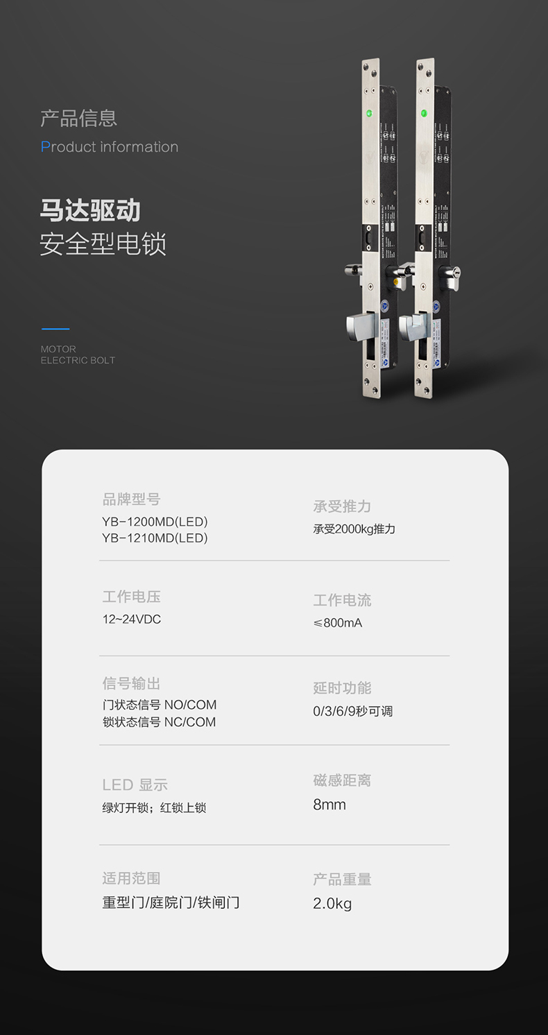 YB-1200MD(LED)是一款馬達(dá)驅(qū)動(dòng)重型電鎖,通過減速電機(jī)帶動(dòng)鎖舌的伸縮,實(shí)現(xiàn)上鎖和開鎖. 減速電機(jī)驅(qū)動(dòng)電插鎖鎖舌伸縮的力度更大,當(dāng)門扇有些變形或偏位時(shí),可借助減速電機(jī)強(qiáng)大的推力推動(dòng)鎖舌伸出,將門拉正實(shí)現(xiàn)上鎖; 可實(shí)現(xiàn)靜音關(guān)閉或打開; 此產(chǎn)品上鎖和開鎖狀態(tài)后無需持續(xù)通電,能耗低, 節(jié)能環(huán)保. 鎖體內(nèi)部帶緊急后備儲(chǔ)能電池,以防在停電時(shí),可以給電機(jī)供電帶動(dòng)插銷自動(dòng)解鎖. 本產(chǎn)品適用于:智能小區(qū)、別墅、辦公樓、公檢法、檢察院、軍隊(duì)、監(jiān)獄、戶外鐵閘門、高檔商店、辦公寫字樓高安保場(chǎng)所。產(chǎn)品已申請(qǐng)專利保護(hù),仿冒必究!