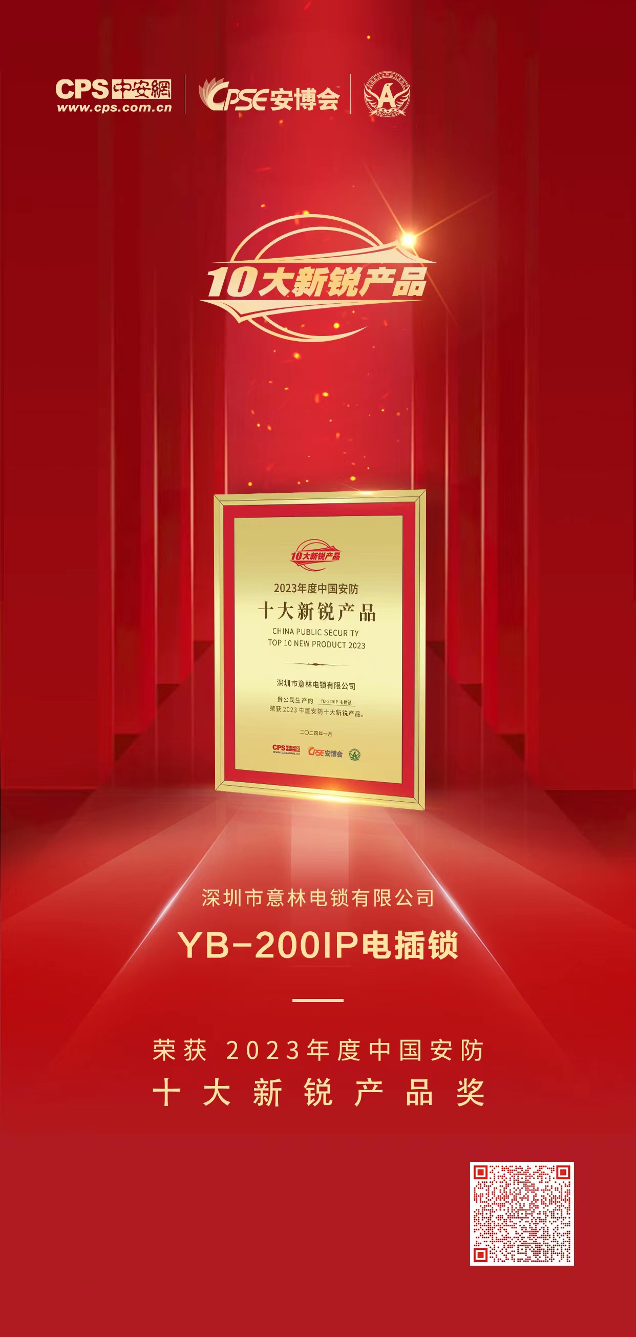 意林電子YB-200IP防水電插鎖憑借實力斬獲“2023 年度中國安防十大新銳產(chǎn)品”