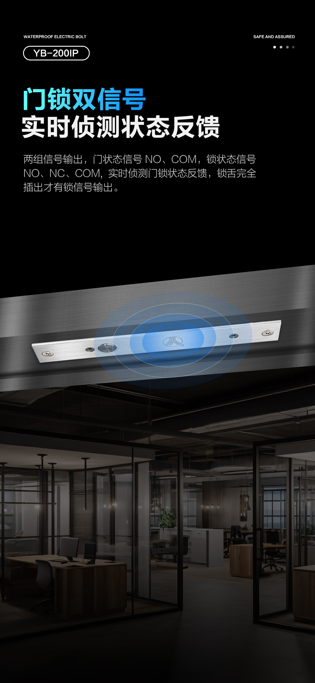 YB-200IP防水電插鎖,經(jīng)過精心設(shè)計和制造,具有優(yōu)異的防水性能,防水等級達到IP66,即使在潮濕的環(huán)境中也能保持穩(wěn)定和安全。鎖舌采用整體式304不銹鋼實心棒材,經(jīng)CNC車床精加工而成,工藝精湛,最高可承受800kg沖擊。門/鎖狀態(tài)信號輸出,實時偵測門鎖狀態(tài)反饋。專業(yè)設(shè)計的耐用型電磁閥,使用壽命超過50萬次測試合格。