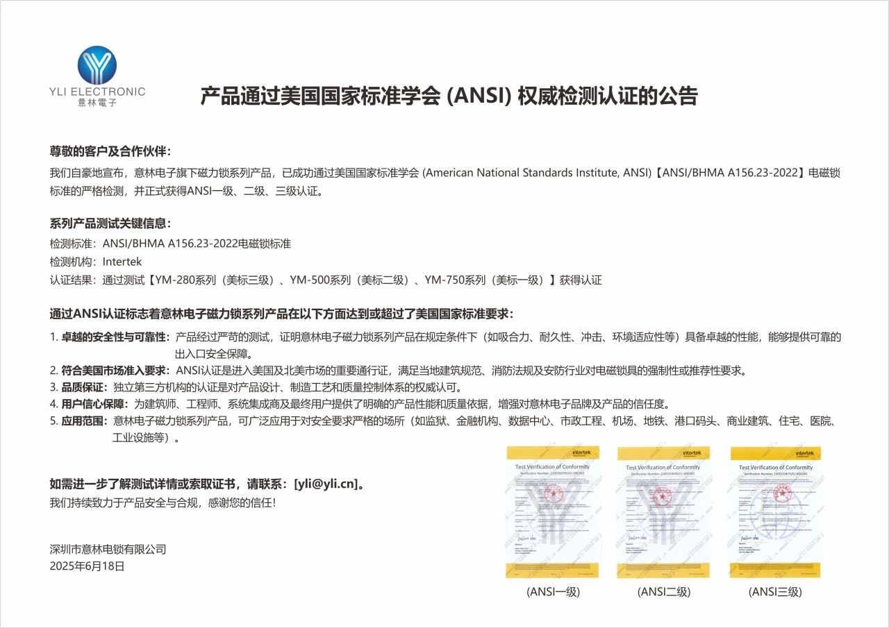 意林產(chǎn)品在安全性、可靠性、耐用性和環(huán)境適應(yīng)性方面,經(jīng)過了全球最嚴(yán)格標(biāo)準(zhǔn)之一的檢驗(yàn),并達(dá)到或超過了該標(biāo)準(zhǔn)的要求。尤其是YM-750系列獲得最高等級的一級認(rèn)證,證明其具備服務(wù)最高安全等級場所的能力,這是對其產(chǎn)品性能的最高認(rèn)可。這為公司打開了北美及全球高端安防市場的大門,是強(qiáng)大的市場競爭優(yōu)勢。為建筑師、顧問工程師、系統(tǒng)集成商和終端用戶提供了權(quán)威、客觀的產(chǎn)品性能和質(zhì)量保證,極大增強(qiáng)了客戶對意林電子品牌和產(chǎn)品的信任度。