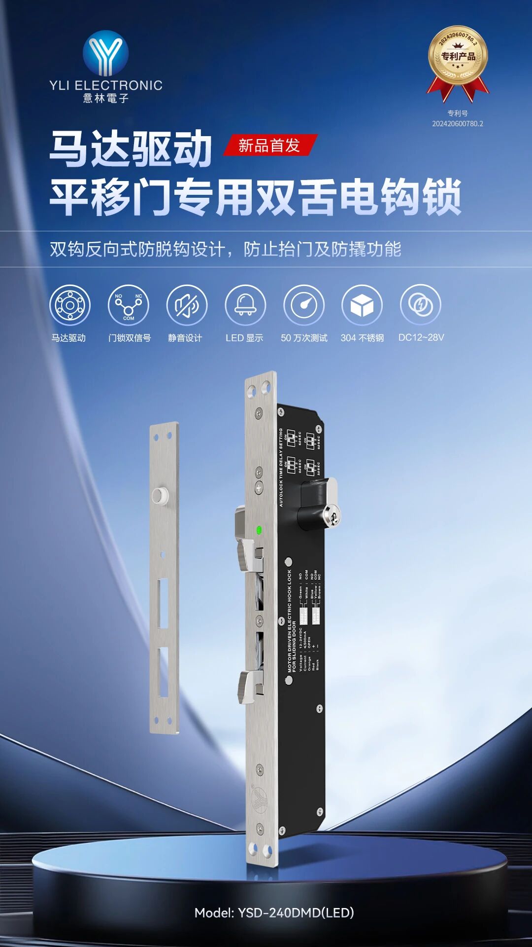 意林電子旗下產(chǎn)品 YSD-240DMD(LED)馬達驅(qū)動平移門專用雙舌電鉤鎖,憑借其專利設(shè)計與高可靠性,成功入選“中國數(shù)字安防十大新銳產(chǎn)品”。該產(chǎn)品是專為平移門場景開發(fā)的電鎖解決方案,突出體現(xiàn)了意林電子將前沿技術(shù)轉(zhuǎn)化為可靠解決方案的強大產(chǎn)品力。