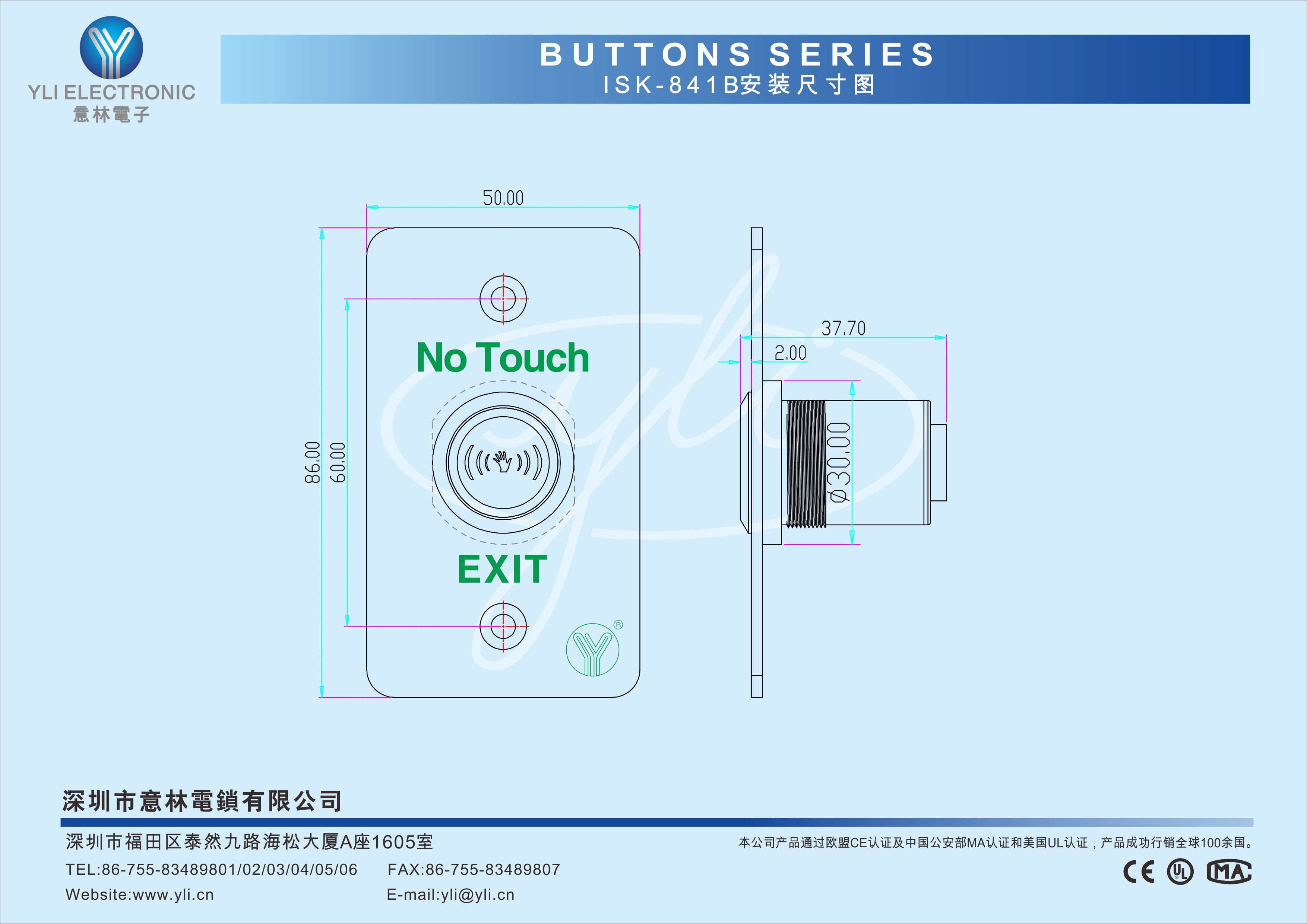 ISK-841B(LED) 是一款紅外感應(yīng)門禁開關(guān), 具有延時可調(diào)功能及紅外感應(yīng)功能,感應(yīng)距離4-12cm可調(diào)。LED燈顯示: 紅色待機狀態(tài); 綠色動作狀態(tài)。采用304不銹鋼拉絲工藝處理,耐磨抗沖擊,堅固耐用。適用于智能樓宇、住宅小區(qū)、辦公樓、酒店、醫(yī)院、體育館等場所使用。
