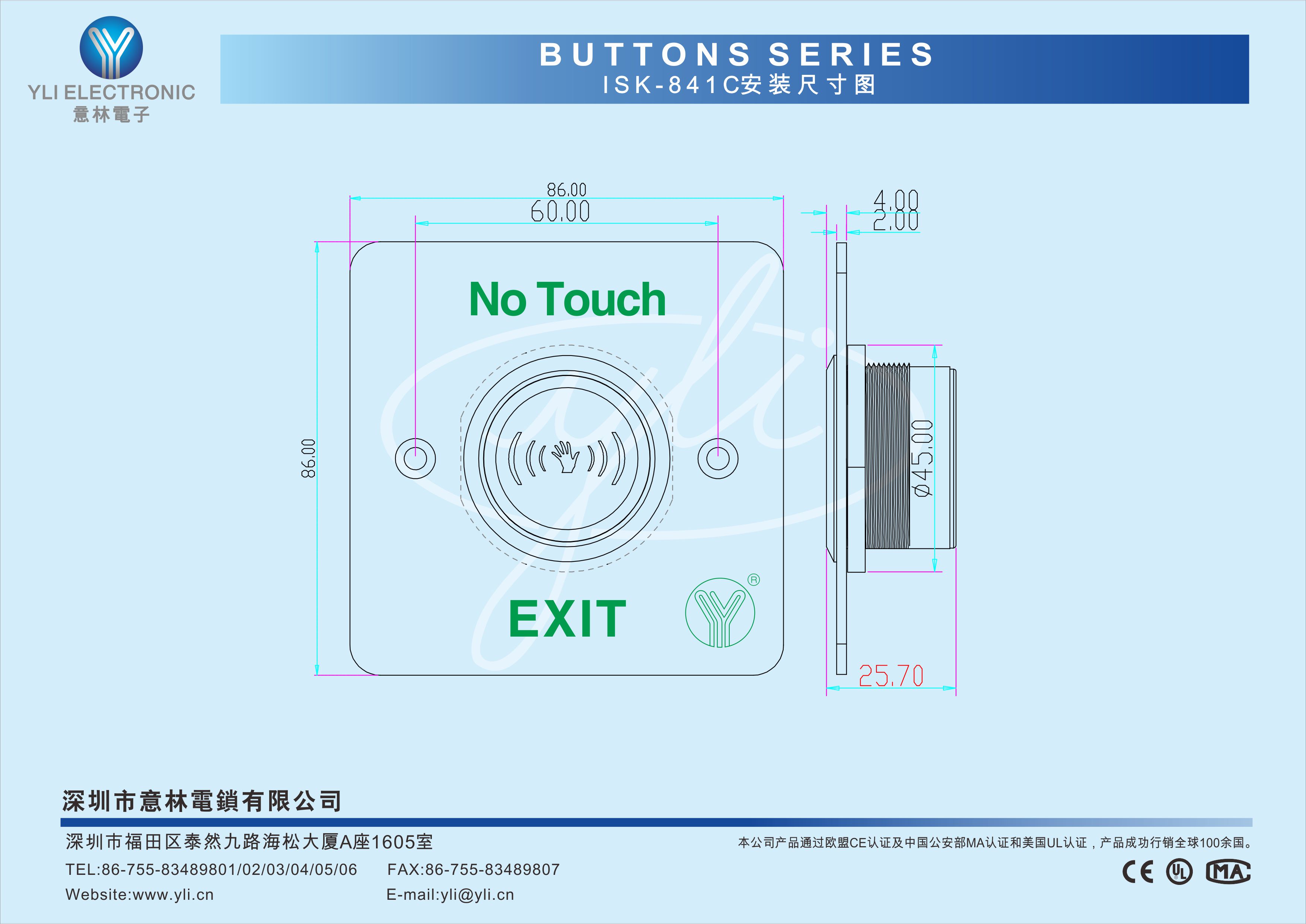 ISK-841C(LED) 是一款紅外感應(yīng)門禁開關(guān), 具有延時(shí)可調(diào)功能及紅外感應(yīng)功能,感應(yīng)距離4-12cm可調(diào)。LED燈顯示: 紅色待機(jī)狀態(tài); 綠色動(dòng)作狀態(tài)。采用304不銹鋼拉絲工藝處理,耐磨抗沖擊,堅(jiān)固耐用。適用于智能樓宇、住宅小區(qū)、辦公樓、酒店、醫(yī)院、體育館等場(chǎng)所使用。