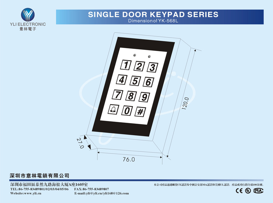 YK-568L是一款采用非接觸感應(yīng)卡和密碼鍵盤(pán)操作的門(mén)禁控制器。可支持500個(gè)用戶,適合室外使用。設(shè)計(jì)先進(jìn)性能優(yōu)越,采用最新的微處理器及大容量存儲(chǔ)芯片,所有已設(shè)置的資料不會(huì)因斷電而丟失。操作簡(jiǎn)單,編程容易,使用方便,安全可靠。適用于辦公室、住宅、工廠等場(chǎng)所的理想門(mén)禁裝置。
