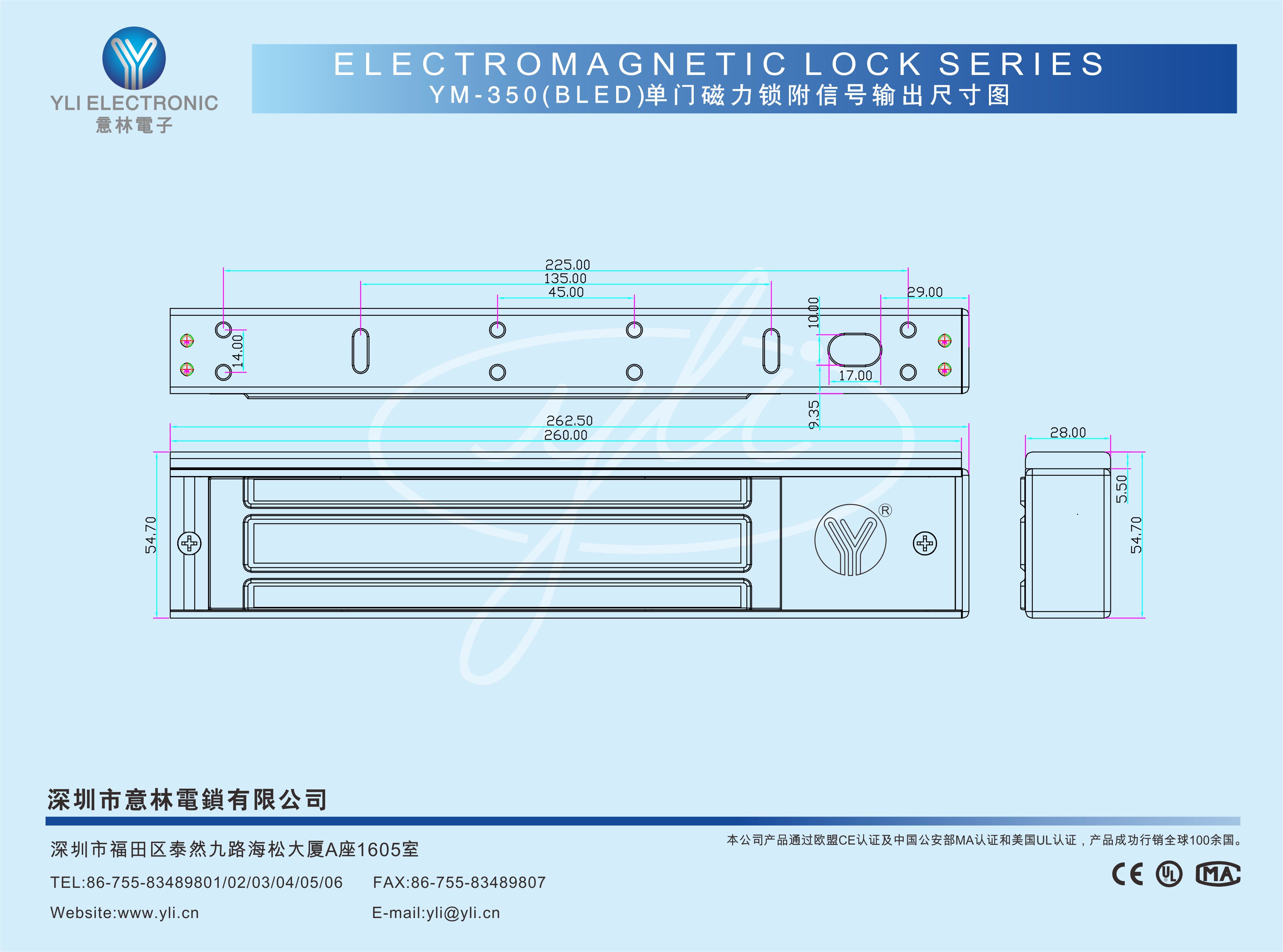 YM-350(BLED)單門磁力鎖附信號輸出(大LED顯示)是針對木門、金屬門、玻璃門、防火門等設(shè)計的。設(shè)有一組鎖狀態(tài)信號(NO/NC/COM)輸出接點,為門禁系統(tǒng)實時反饋信息,鎖體側(cè)面設(shè)有加大LED燈顯示,綠燈開鎖,紅燈上鎖。意林磁力鎖加大電磁吸力設(shè)計,吸力超強,鎖芯特殊加強焊接工藝,抗撞擊力及抗扭力比常規(guī)生產(chǎn)工藝強2-3倍,更堅固耐用。表面處理采用國際領(lǐng)先的電鍍工藝,通過國家實驗室240小時鹽霧測試,達到防氧化、防銹、防腐性能。適用于日常辦公場所或沿海鹽霧,潮濕(如:地鐵,機場,核電站,跨海大橋,港口碼頭,醫(yī)療機構(gòu),沿海城市建筑)等場景使用。本公司產(chǎn)品規(guī)格及配套齊全,內(nèi)開式門或無框玻璃門、窄框門等均有安裝支架配套,有效滿足現(xiàn)代智能建筑的各種場景需求。